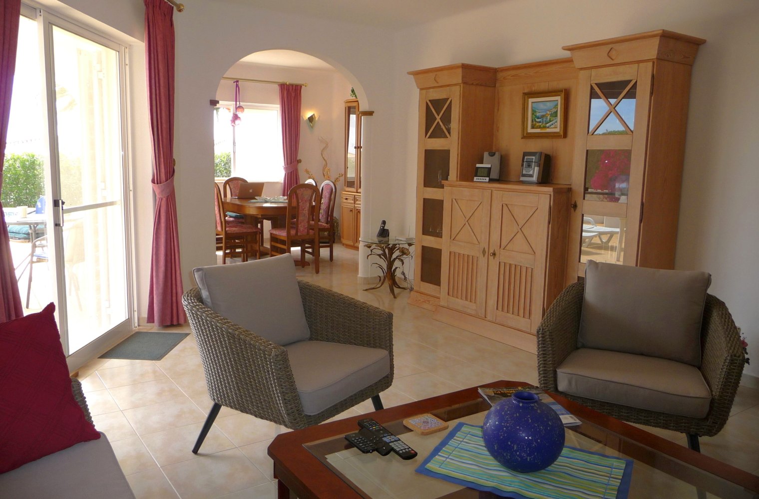 Von dem geschmackvollen Wohn-/Esszimmer aus geht es auf die möblierte Terrasse und den Poolbereich mit Sonnenliegen und Barbecue-Grill. Hervorzuheben ist der beliebte Schattenplatz unter zwei wunderschönen Palmen.