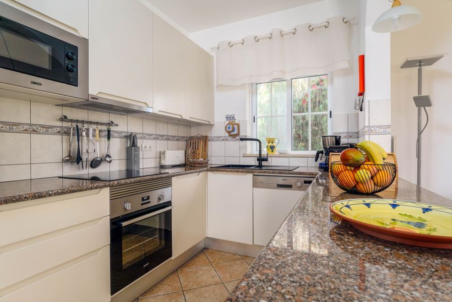 Über eine große Schiebetür gelangt man auf die Terrasse mit offenem Grill. Von hier aus genießen Sie einen herrlichen Blick auf die weite portugiesische Landschaft und den mediterranen Garten, der mit viel Lirbe zum Detail gestaltet wurde. Die Terrasse ist von blühenden Beeten und großen Palmen umgeben. WLAN, Handtücher, Strandhandtücher, Geschirrtücher, Bettwäsche und ein Föhn sind vorhanden! Die gut ausgestattete Küche verfügt unter anderem über eine Nespressomaschine.