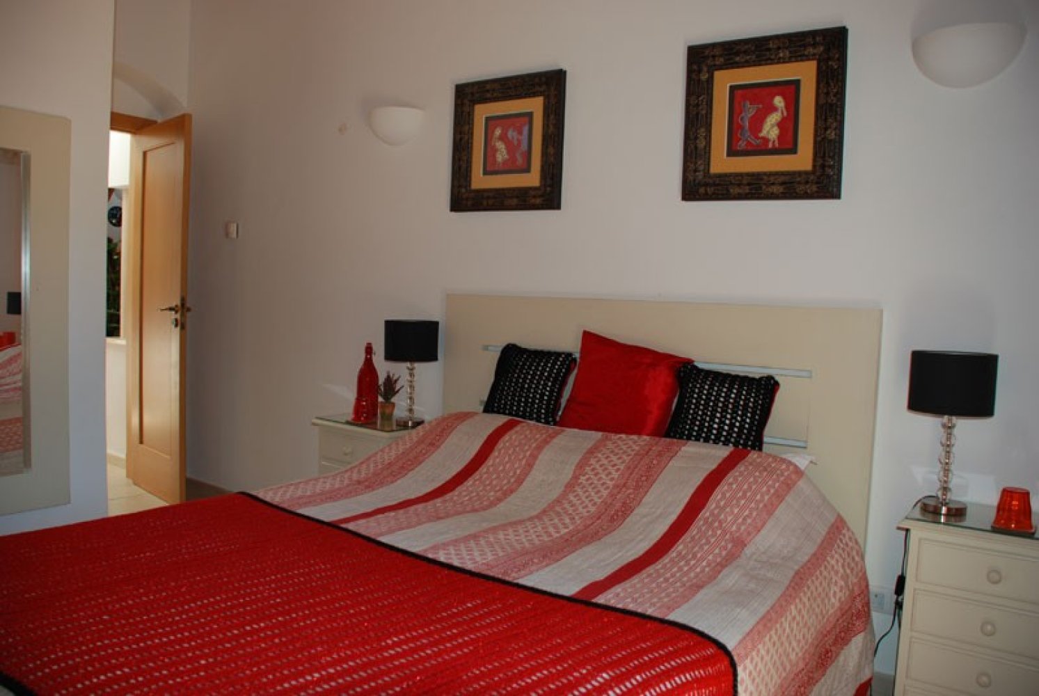 Es gibt jeweils zwei Schlafzimmer auf beiden Seiten des Wohnbereich, von denen zwei über ein eigenes Bad en suite verfügen. Ein drittes Duschbad dient den restlichen zwei Schlafzimmern