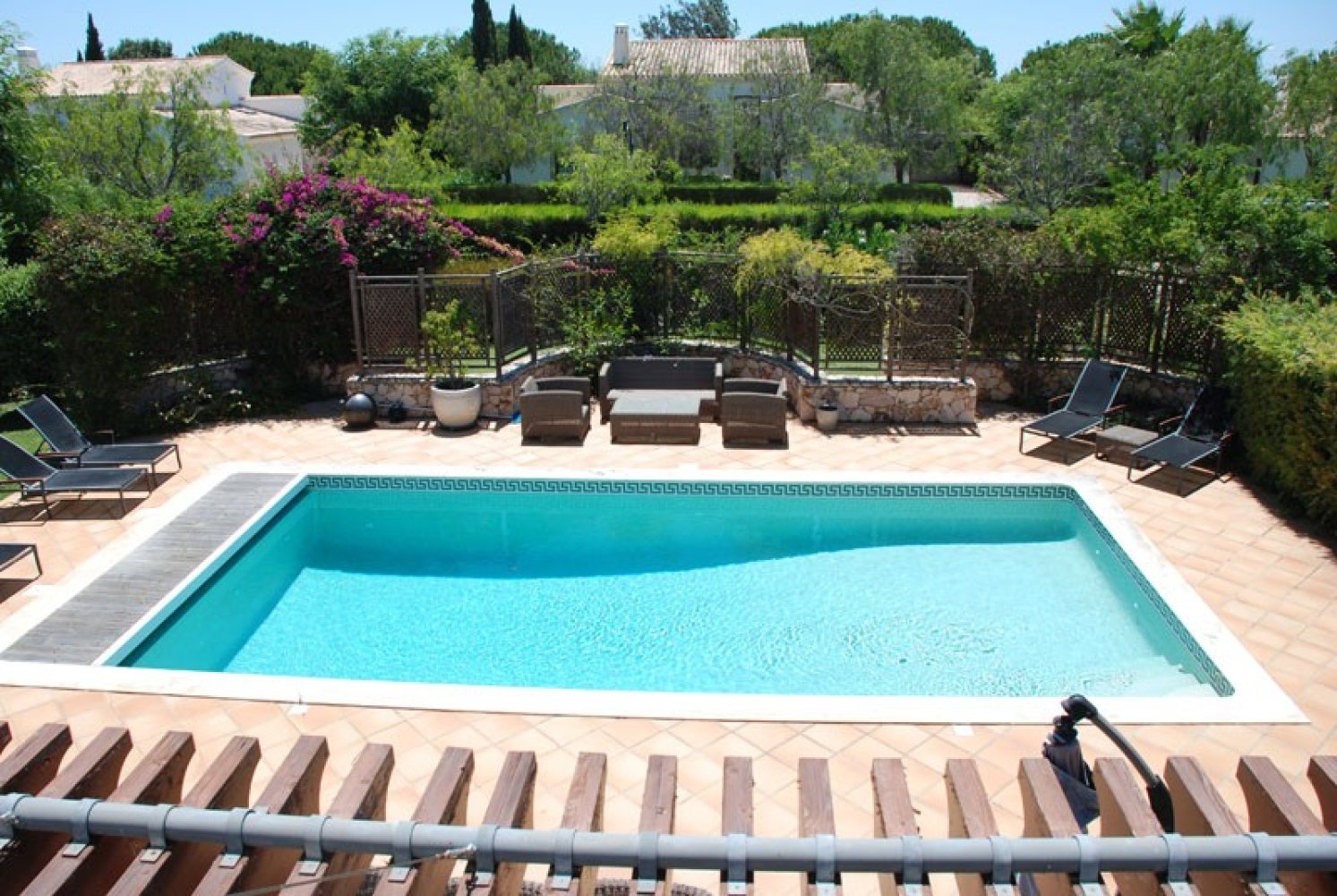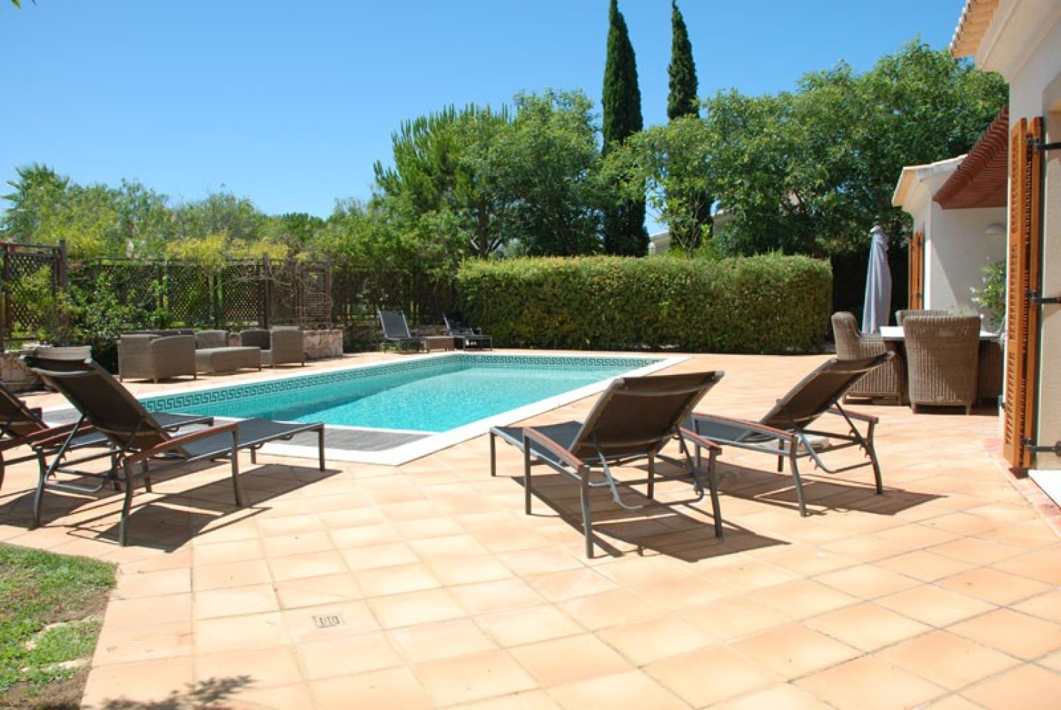 Zwei große Flügel-Terrassentüren öffnen sich vom Wohnbereich auf die Hauptterrasse und zum Poolbereich, mit Außenbestuhlung für 10 Personen und Sonnenliegen für 8 Personen, Weber-Grill, abgeschirmtem privatem beheiztem Pool mit Salzwasserchlorierer, solarbeheizter Pooldusche und elektrisch betriebener Poolabdeckung .