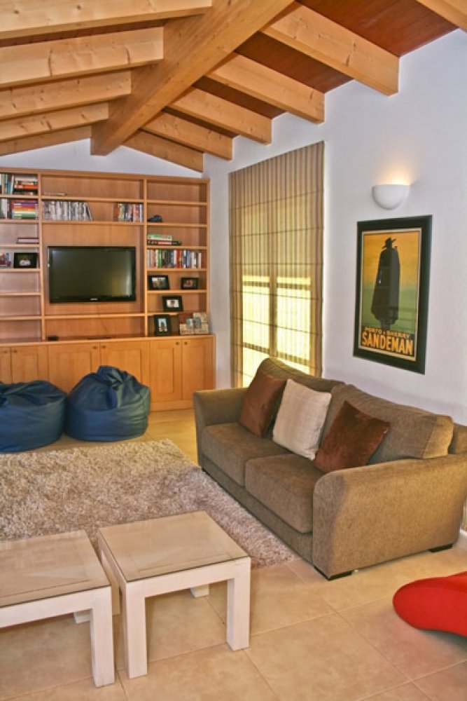 Dort befindet sich ein weiterer Wohnraum mit Fernseher und Schreibtisch, sowie Zugang zur Terrasse mit Panoramablick auf die umliegende Landschaft.