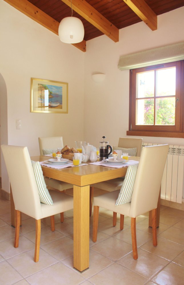 Essbereich mit großem Tisch und Stühlen, und Fenstertüren zur Terrasse