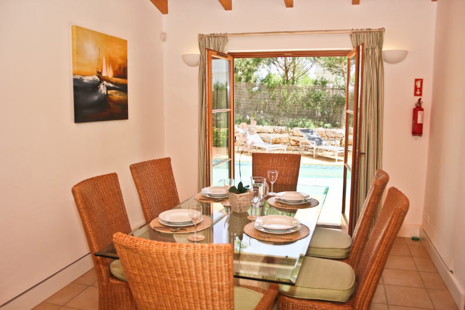 Essbereich mit großem Tisch und Stühlen, und Fenstertüren zur Terrasse