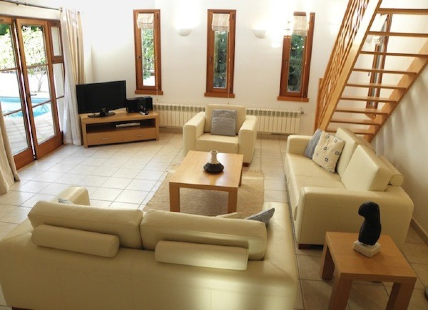 Wohnzimmer, teilweise in doppelter Höhe, mit großen Ledersofas, TV mit Flachbildschirm, DVD- Musik-System.