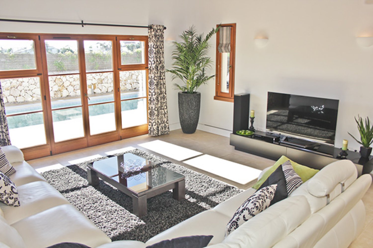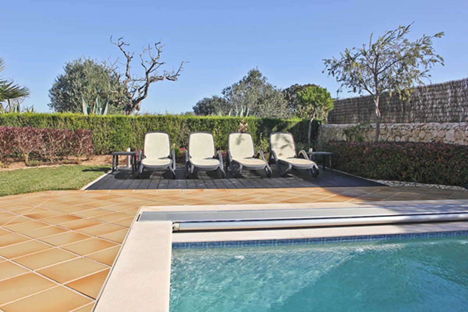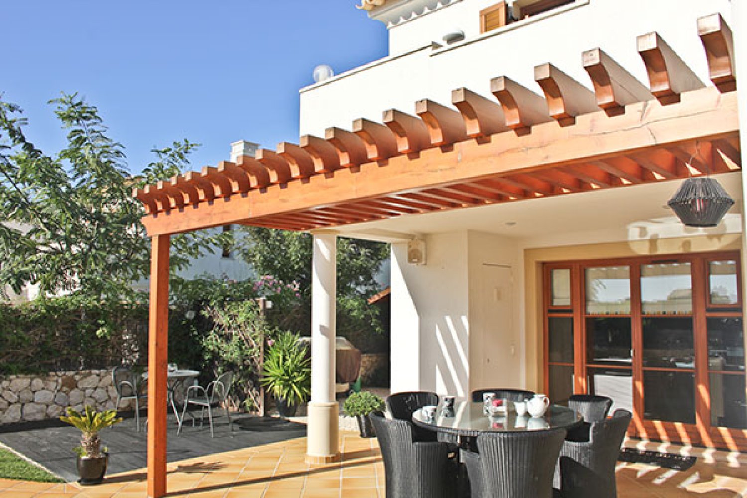 Sowohl der Wohnbereich als auch die Küche haben große Terrassentüren, die zu einer Südterrasse führen, die mit einer Holzpergola überdacht ist, und zu dem großen, privaten, beheizten Pool mit seiner elektrisch betriebenen Poolabdeckung.