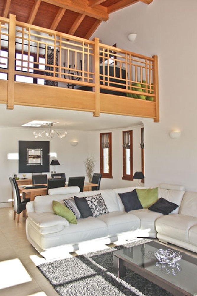 Der Flur führt zum großen offenen Ess- und Wohnbereich (41 m²) mit doppelter Höhe, gewölbter Holzdecke und Galerie darüber. Der Küchenbereich ist durch einen Torbogen vom Essbereich zu erreichen.