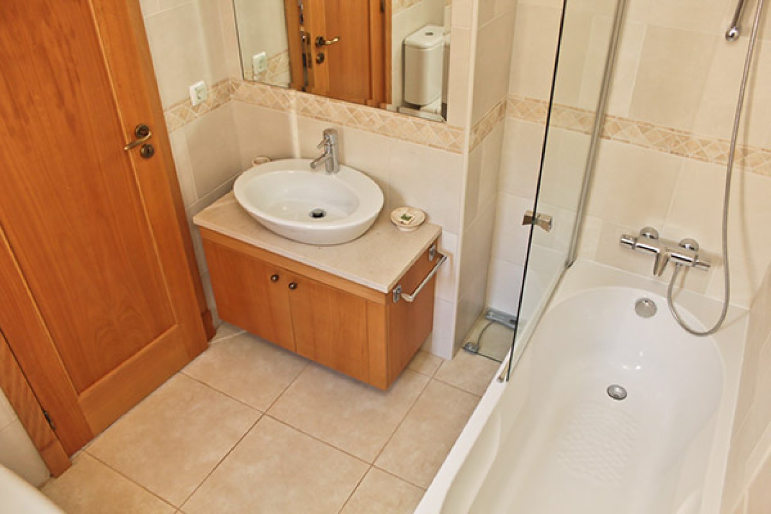 En-suite zum Schlafzimmer 1 mit Badewanne / Dusche, WC und Waschbecken