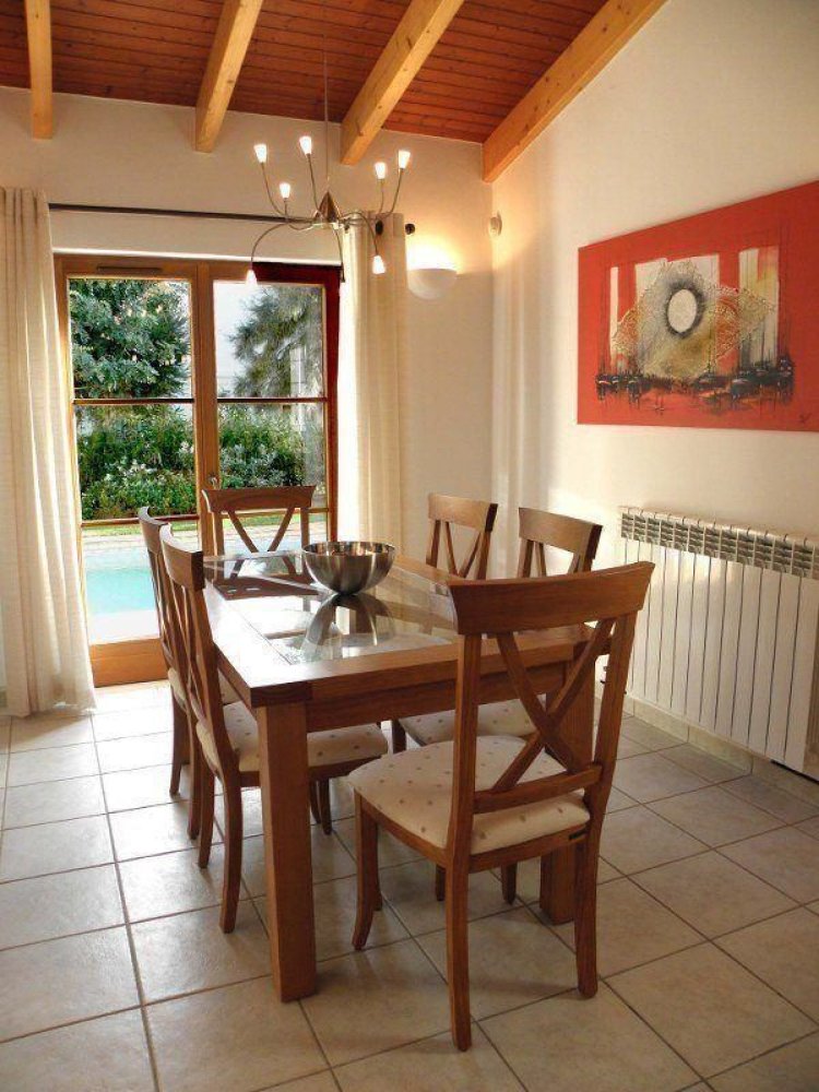 Essbereich mit großem Tisch und Stühlen, und Fenstertüren zur Terrasse