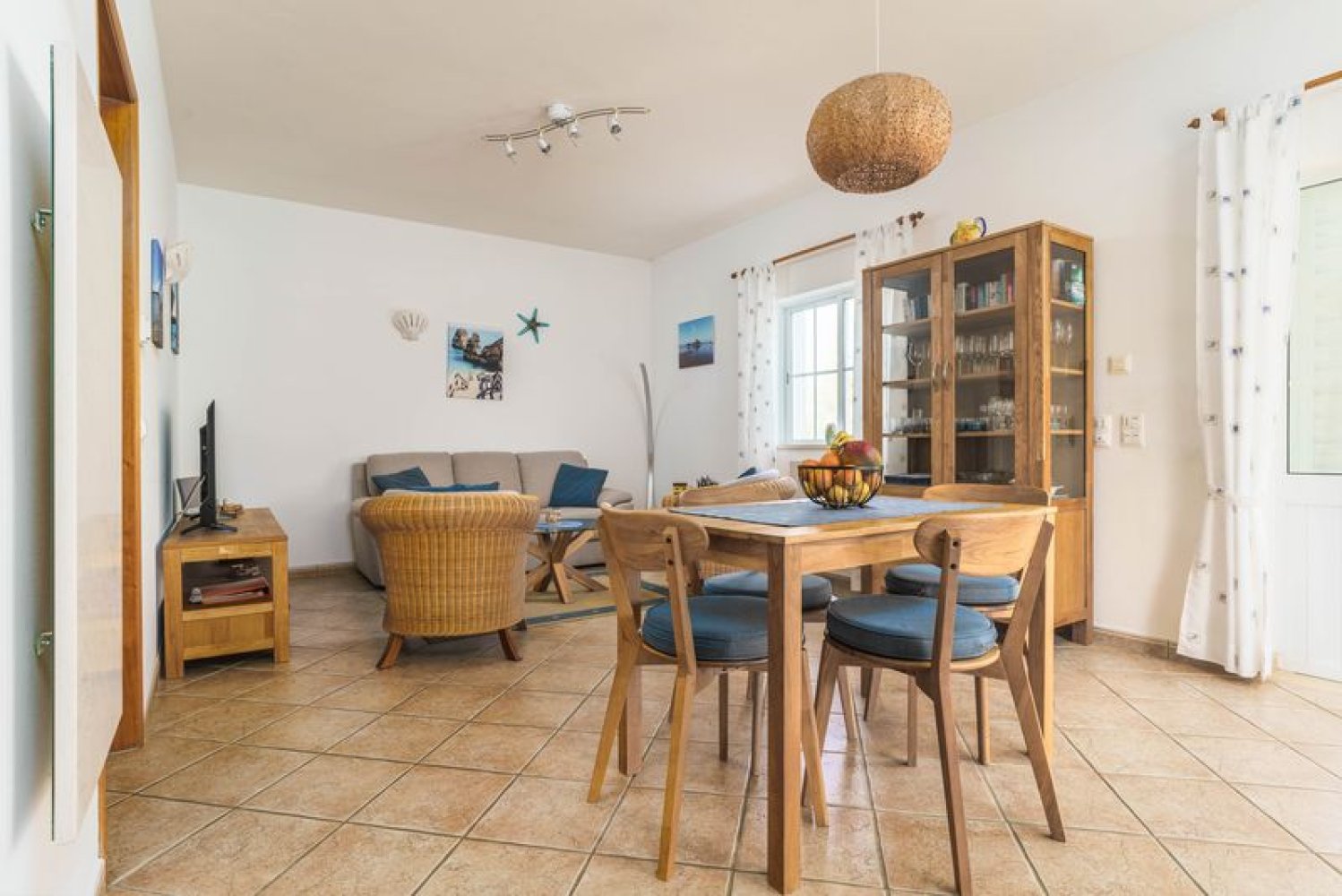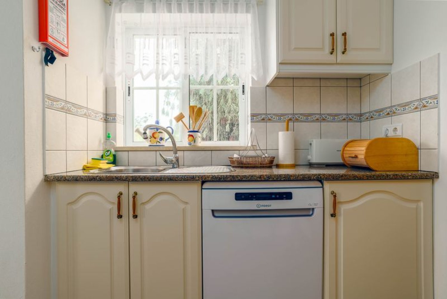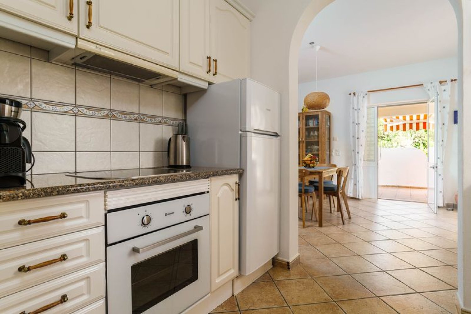 Die kleine Wohnung ist mit seinen 2 Schlafzimmern für 4 Personen geeignet, idealerweise für eine Familie mit 2 Erwachsenen und zwei Kindern. Das schöne Bad, komplett 2018 renoviert, ist von jedem Schlafzimmer zugänglich und verfügt über ein Waschbecken, Dusche, WC und Bidet. Das gemütliche, im Landhausstil eingerichtete Wohn-/Esszimmer, mit offener, gut ausgestatteter Küche ( unter anderem mit Nespresso-Maschine und Geschirrspüler), bietet alles für einen erholsamen Urlaub. Das Wohnzimmer verfügt über einen Flachbildfernseher, CD Player, Radio, Spiele und eine Vielzahl an Büchern. Ein runder Eßtisch verbindet den Küchenbereich mit dem Wohnzimmer. Aus dem Wohnbereich können Sie über große Glastüren auf die Terasse gehen. Von hier aus genießen Sie einen herrlichen Blick auf die weite portugiesische Landschaft, den mediterranen Garten und den Poolbereich. Die Terrasse ist von blühenden Beeten und großen Palmen umgeben. WLAN, Handtücher, Strandhandtücher, Geschirrtücher, Bettwäsche und ein Föhn sind vorhanden! Die gut ausgestattete Küche verfügt unter anderem über eine Nespressomaschine.