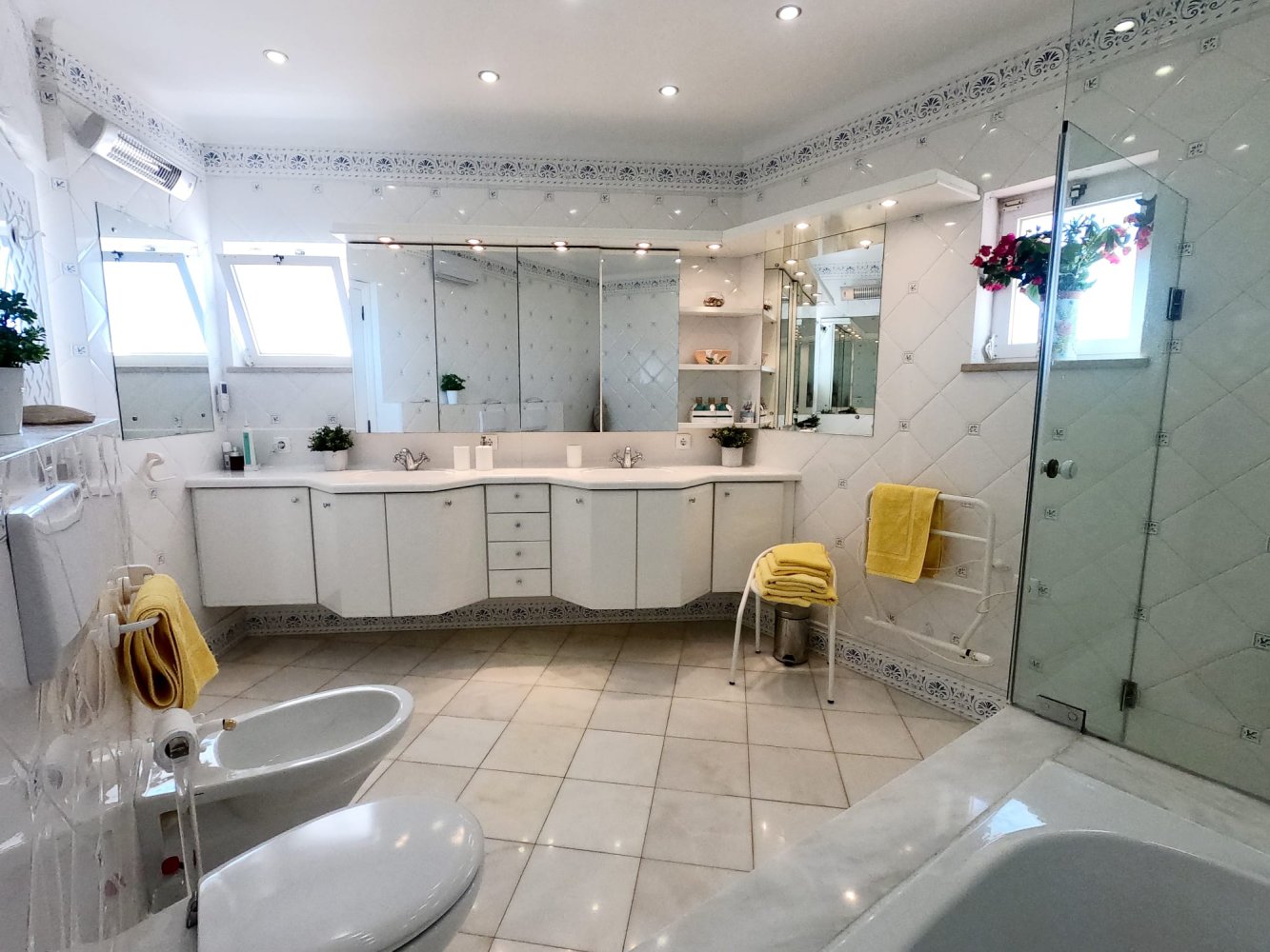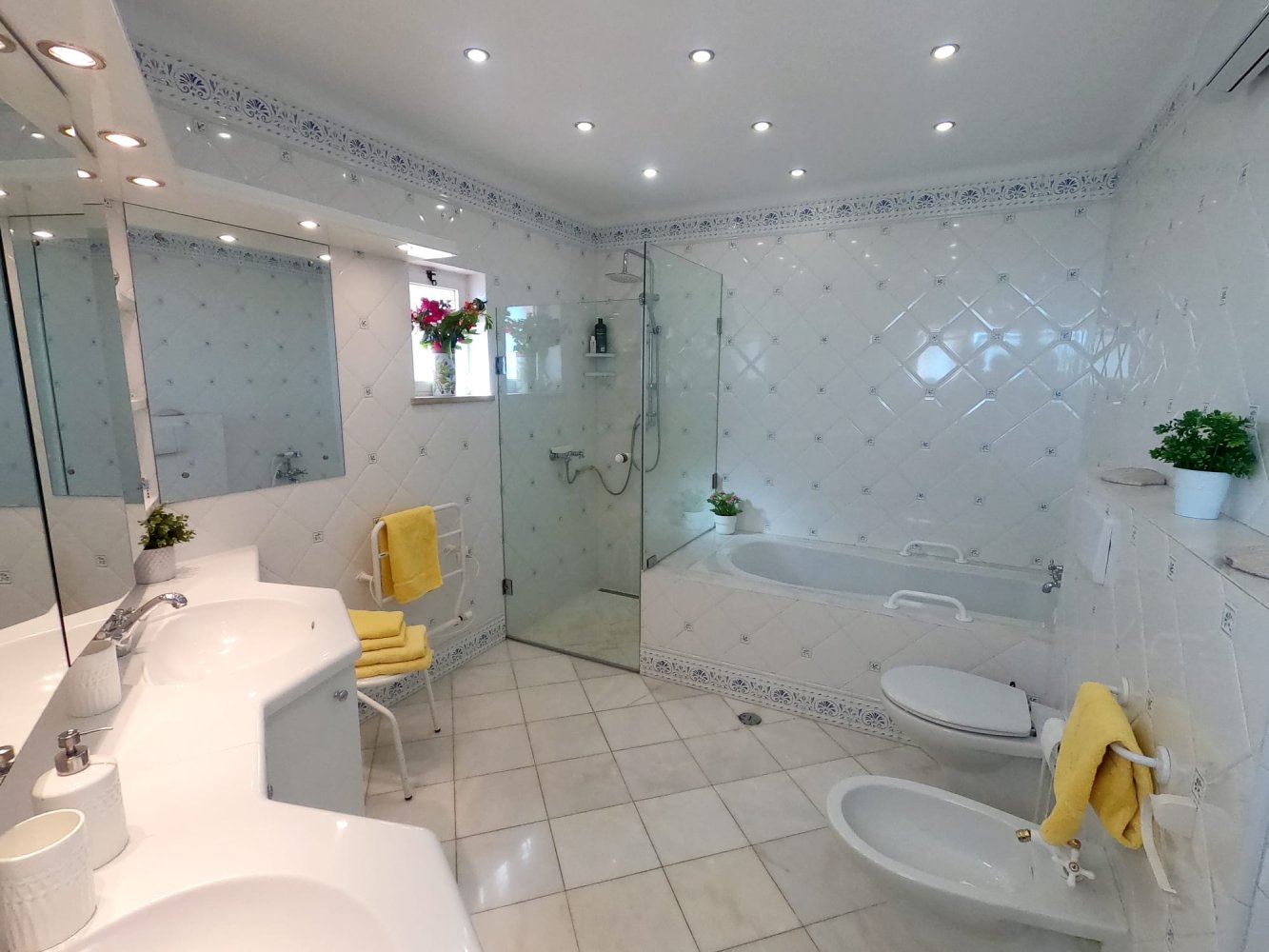 Alle Schlafzimmer verfügen über Klimaanlage und großzügige en Suite Bäder, zwei mit Badewanne und Dusche, eines mit großer begehbarer Dusche. Die Fliesen sind in freundlichem Blau/Weiß gehalten und entsprechen somit den typischen und traditionellen Farben der Portugiesen.