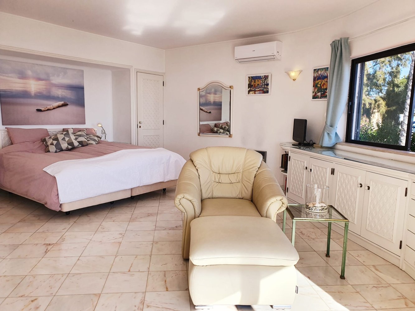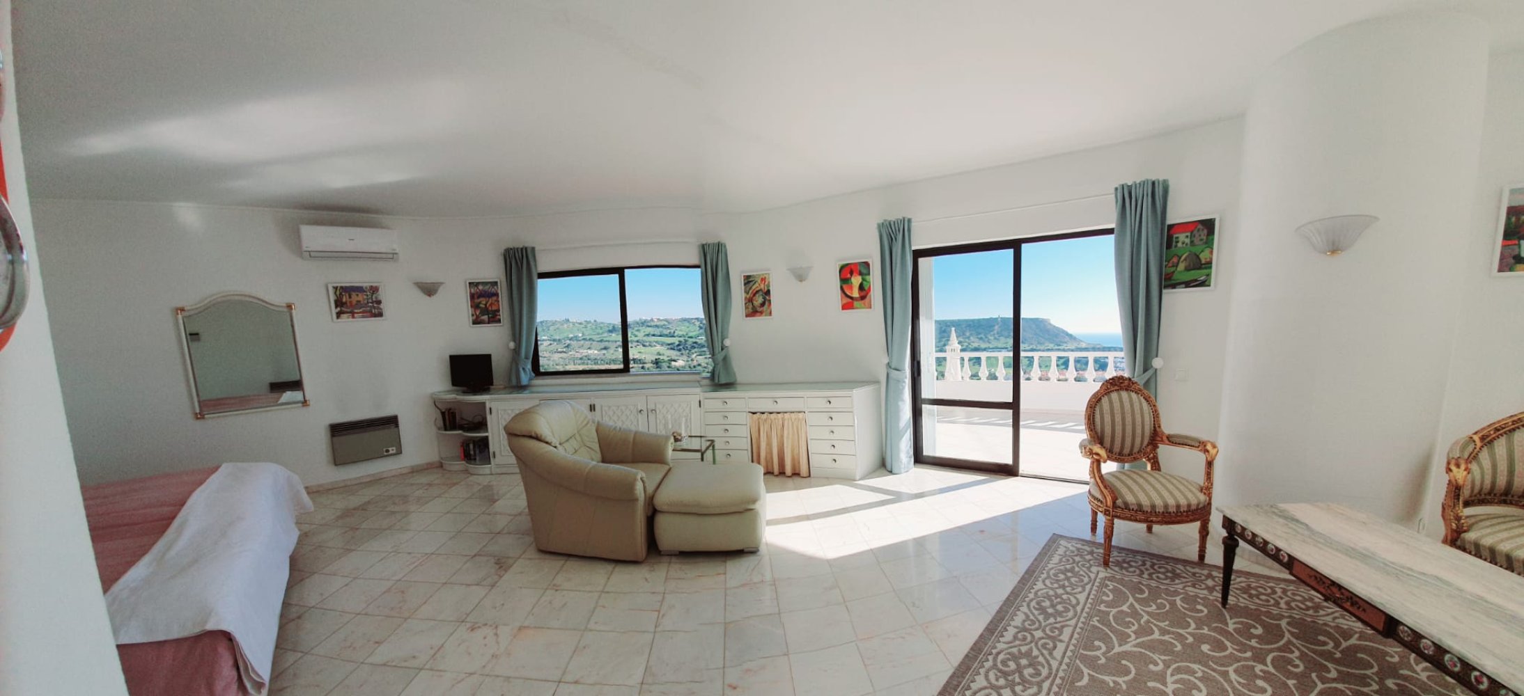 Die Villa ist von der Aufteilung optimal für 3 Ehepaare oder eine 6 köpfige Familie. Die drei freundlich eingerichteten Schlafzimmer verfügen jeweils über Doppelbetten mit getrennten Matratzen, großzügige Einbauschränke und Fliegengitter. Die Matratzen und Fenster sind in allen Zimmern kürzlich erneuert worden. Das helle Master-Schlafzimmer im Obergeschoss ist ein großzügiges Wohnschlafzimmer ( ca 60qm ),es besticht durch seine halbrunde Architektur mit großen Fenstern, die den Blick auf das Meer frei geben.Das Bett ist hier 1,80x2,00 m groß. Vorgelagert befindet sich die nicht einsehbare Terrasse mit atemberaubendem Meerblick. Die beiden Schlafzimmer im Erdgeschoss verfügen ebenfalls über Doppelbetten mit Einzelmatratzen. Ein Zimmer mit Bettengröße1,80x1,95 m und ein Zimmer mit Bettengröße 1,80x2,00m.