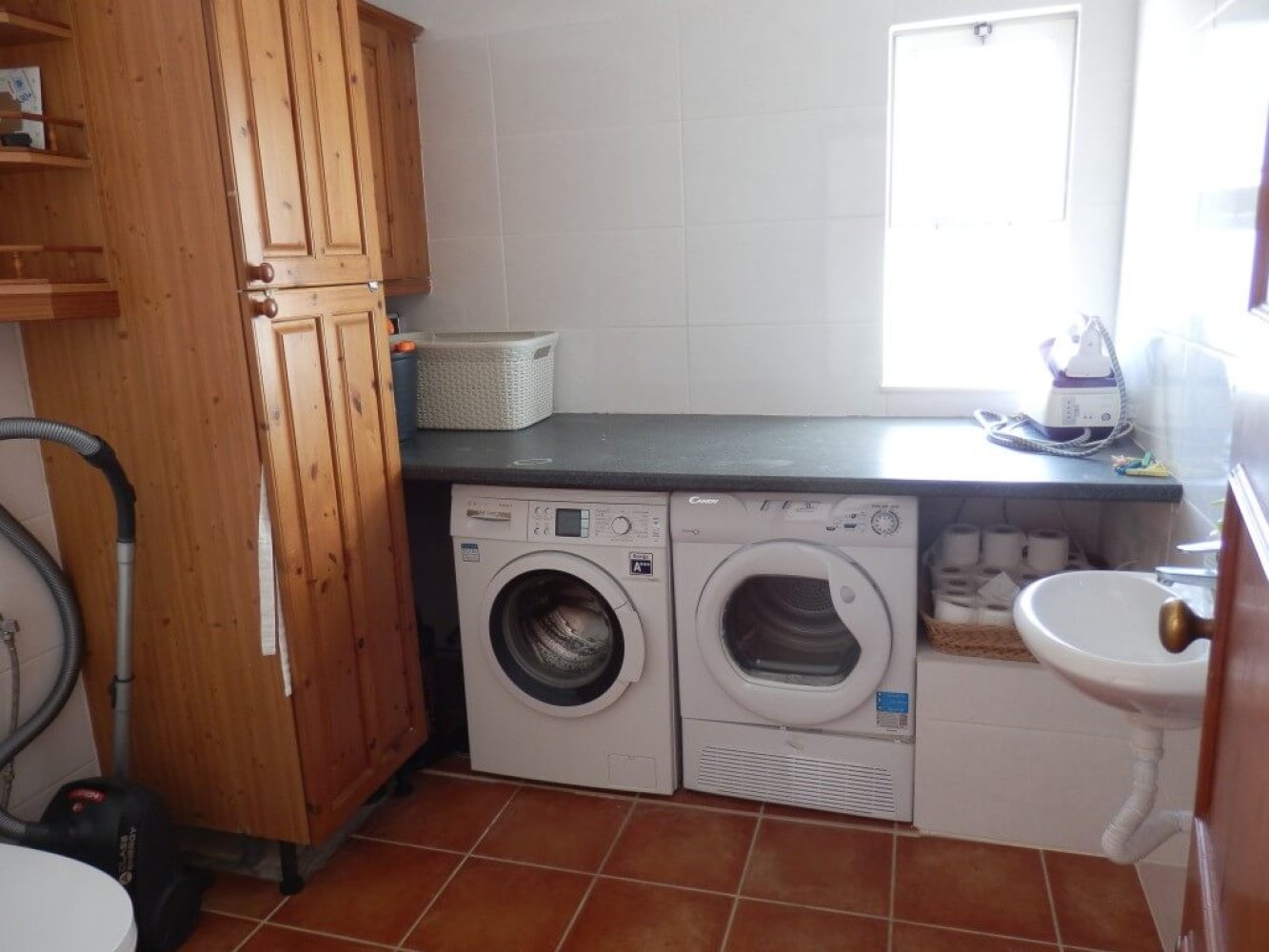 Vom Eingangsbereich des Hauses mit Zugang zu 3 Schlafzimmern, gelangen Sie in den geräumigen Wohnbereich. Dieser Bereich umfasst einen großen Loungebereich mit bequemen Sitzgelegenheiten, einem Holzkamin, einem Fernseher und dem Zugang über große Schiebetüren zur Poolterrasse. Angrenzend a den Loungebereich befindet sich ein Essbereich mit einem großen Glastisch und Sitzgelegenheiten für 8 Personen, ebenfalls mit großen Schiebetüren zur Poolterrasse. In der gut ausgestatteten, großzügigen Küche, die a den Wohnbereich eingrenzt, macht das Kochen richtig Spaß. Eine Tür zur Einfahrt ermöglicht es, die Einkäufe auf kurzem Weg direkt vom Auto in die Küche zu tragen. Sie geht in ein weiteres Esszimmer mit Holzmobiliar über. Von dort gelangen Sie durch große Glastüren zum Essbereich im Freien, der unter einer mit Holz bedeckten, idyllischen Pergola liegt. Außerdem gibt es einen kleinen Hauswirtschaftsraum mit Waschmaschine und Trockner.Durch das zweite Esszimmer gelangen Sie auch in den zweiten Schlaftrakt mit zwei Schlafzimmern, die ineinander übergehen und je ein eigenes Bad haben. Da diese beiden Schlafzimmer über eine Tür direkt miteinander verbunden sind, eignen sie sich perfekt für eine Familie mit kleineren Kindern. Dieser Bereich ist auch durch eine eigene Haustür zu erreichen und das hintere Zimmer über eine extra Tür vom Garten aus, wenn gewünscht.