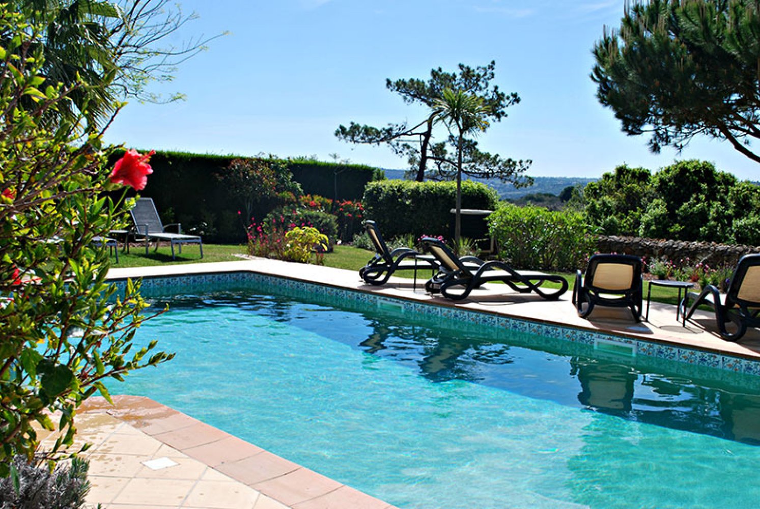 Eingezäunte Stufen zum Garten und zum Poolbereich mit Sonnenliegen für 6 Personen, großem (9 x 4,5 m) beheiztem Privatpool, Salzwasser-Chlorator, Poolheizung und -abdeckung
