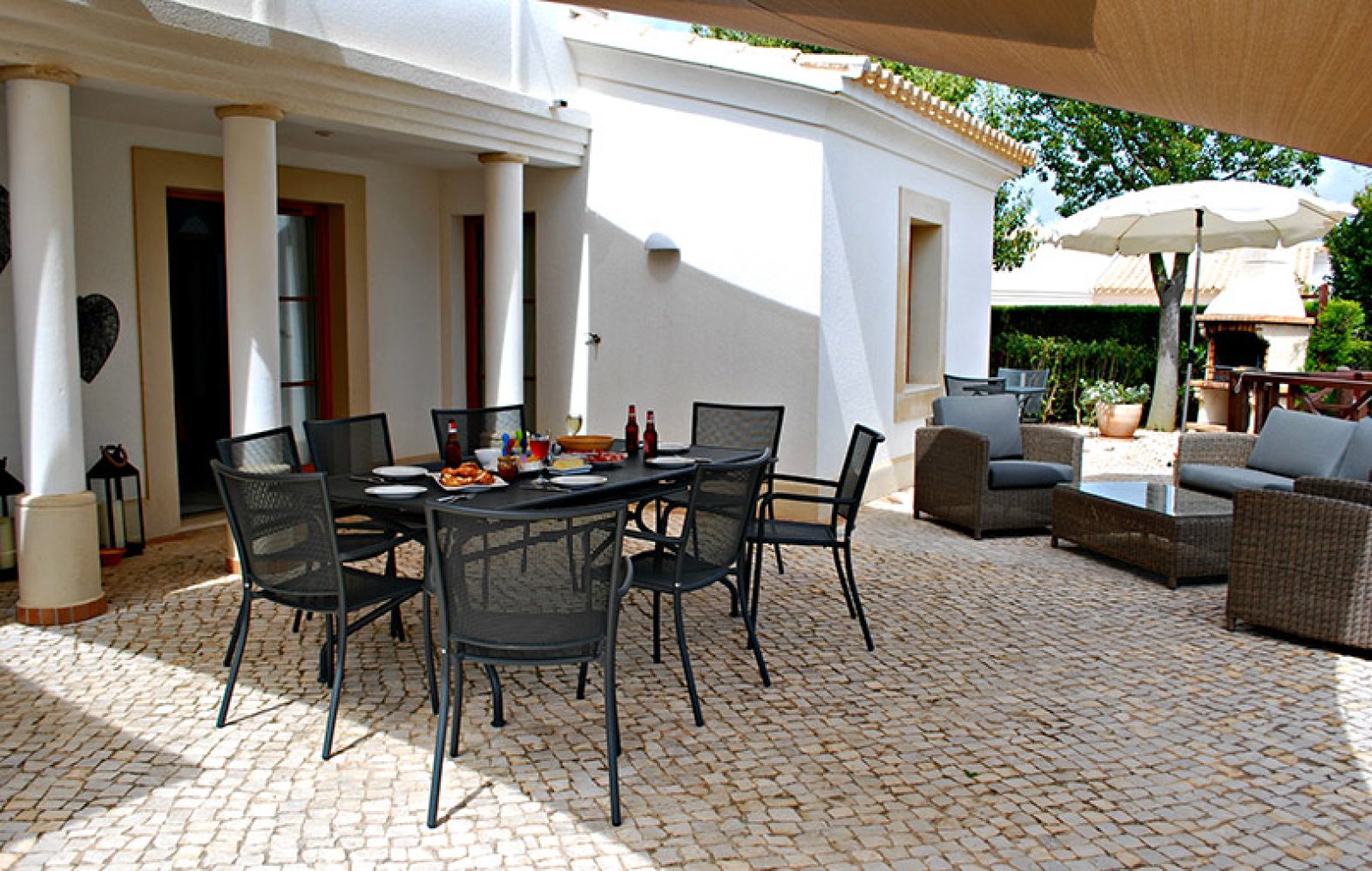 Die Terrassentüren öffnen sich vom Wohnbereich auf die uneinsehbare Außenterrasse, welche ausreichend mit einem Doppelschattensegel beschattet wird und mit Grill und Sitzgelegenheiten für 10 Personen ausgestattet ist.