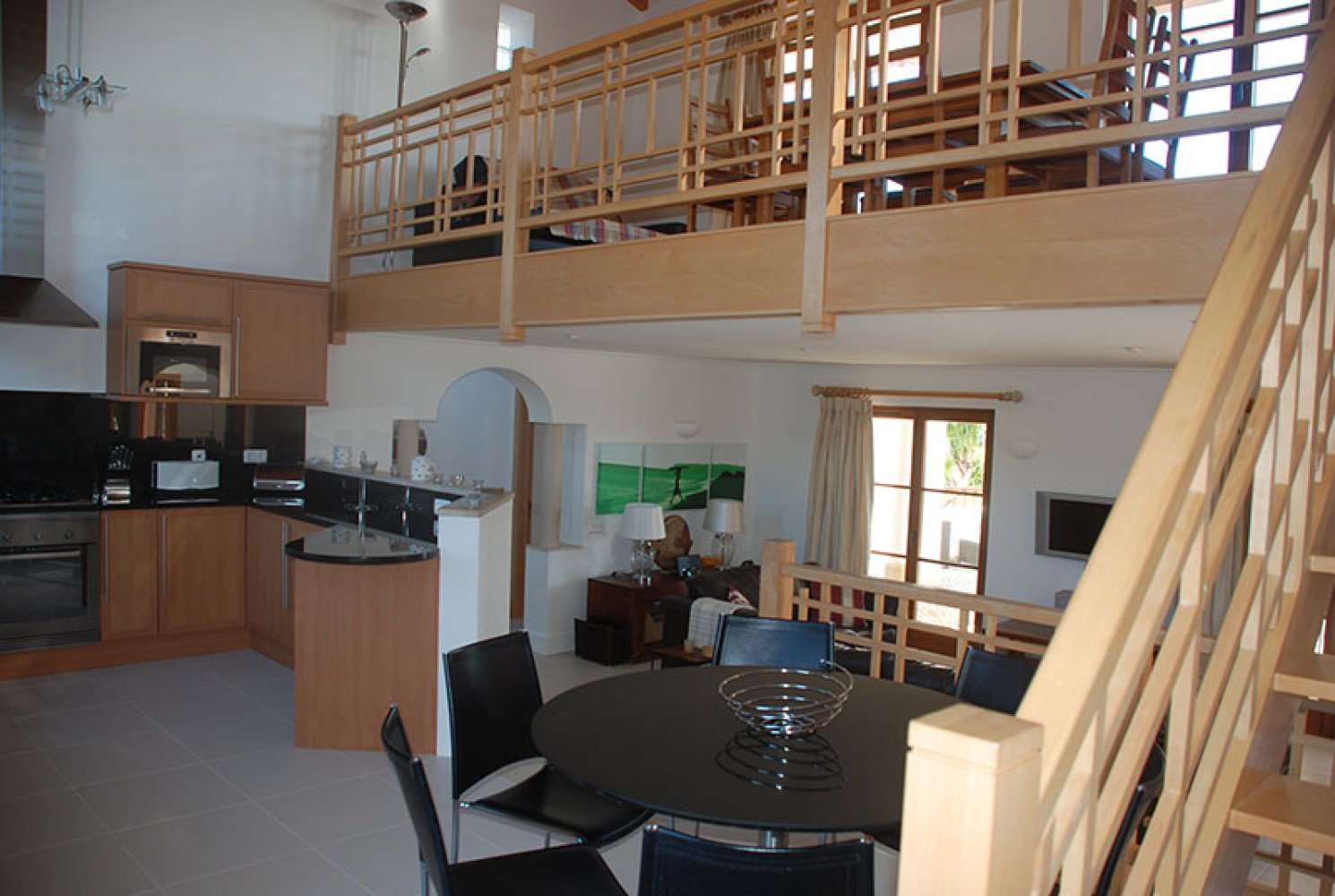 Der Galerieboden über dem Hauptwohnbereich ist über eine Holztreppe mit kleinem Tor zugänglich und bietet einen zusätzlichen Wohnbereich mit Esstisch und 8 Stühlen, 1 Schlafsofa für 2 Personen, Musikcenter und Spielen.Terrassentüren führen zu einer Dachterrasse mit Panoramablick.