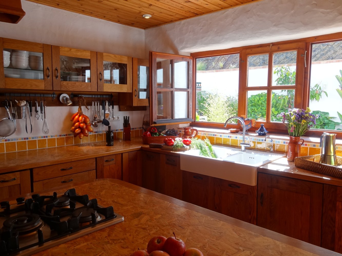 Sowohl vom hellen Schlafzimmer wie auch vom Wohnzimmer gelangt man auf die große, private Terrasse mit Blick in den mediterranen Garten. Das Wohnzimmer ist mit einem 55Zoll Smart TV ausgestattet. Die sehr gut ausgestattete Küche aus Vollholz grenzt an das Wohnzimmer mit