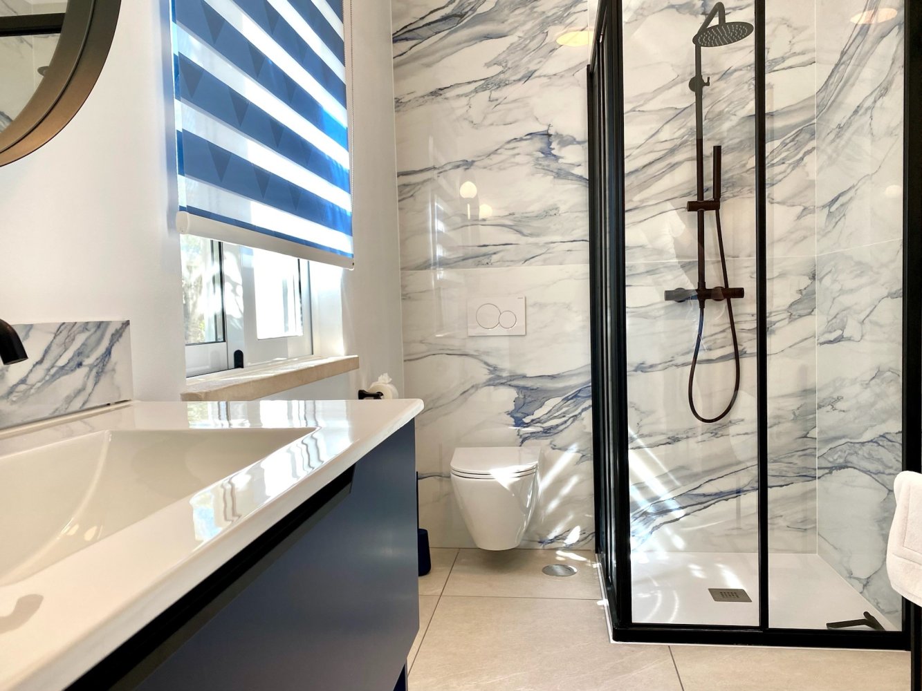 Waschbecken im Waschtisch mit Unterschrank, Dusche, WC, alle Bäder “en Suite” zugänglich vom Schlafzimmer