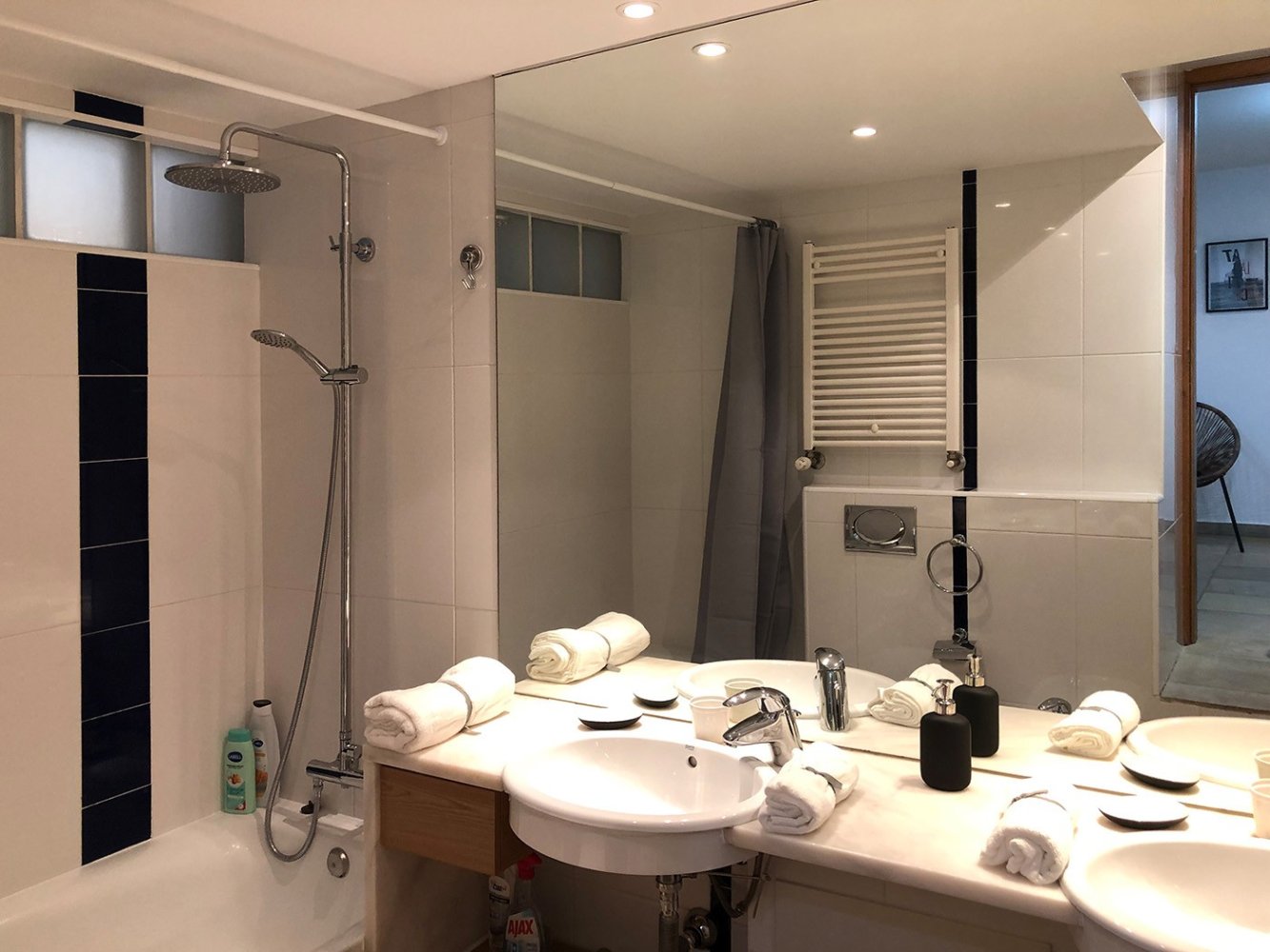 Sie verfügt über eine offene, gut ausgestattete Küche, ein Schlafzimmer ( Bett 180cm x 200cm),ein Badezimmer mit zwei Waschbecken, Badewanne und Regendusche.