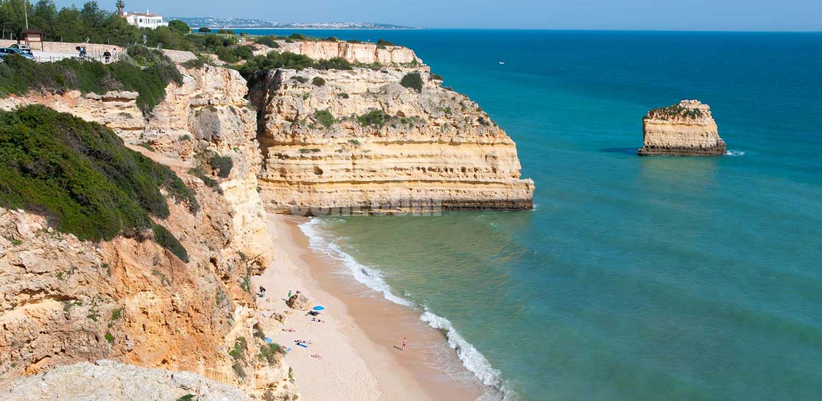 The access road to Carvoeiro ends at the main square and town centre. To the left and right, the square is picturesquely framed by the rising rocky coast. In summer, music is played here on a small stage in the evenings and people meet here in the numerous cafés and restaurants.